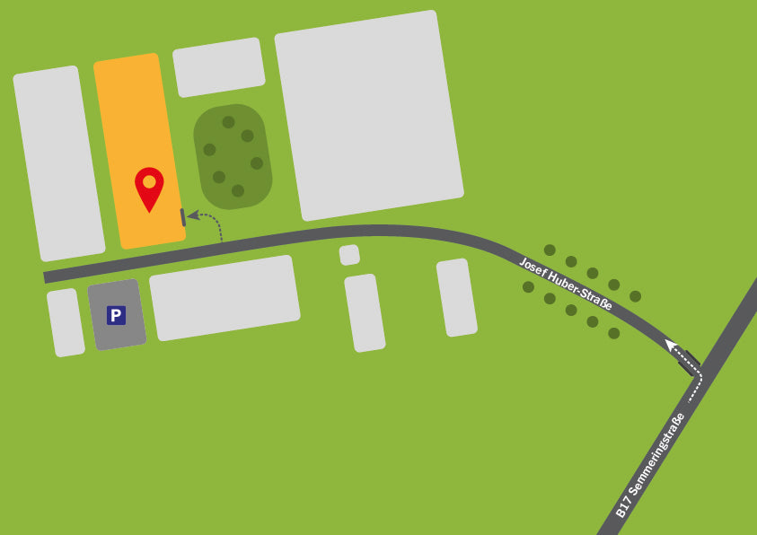 Wenn Sie sich auf der B17 Richtung Neunkirchen befinden, biegen Sie circa 400m nach der Ampel bei der Brücke links in die Josef Huber-Straße ein und fahren Sie an den Wohnhäusern vorbei bis Sie das gelbe Gebäude sehen. Kostenlose Parkmöglichkeiten stehen links vom gelben Gebäude zur Verfügung. Unser Büro befindet sich bei der Hausnummer 6 im ersten Stock.